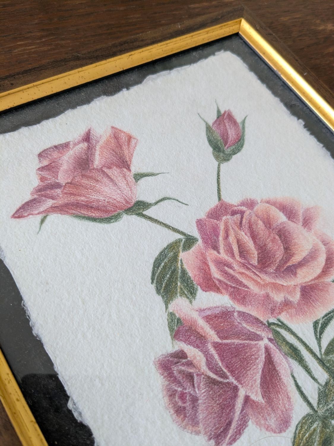Réalisée sur un papier coton texturé, cette illustration de roses aux crayons de couleur apportera un côté champêtre et romantique à votre intérieur.