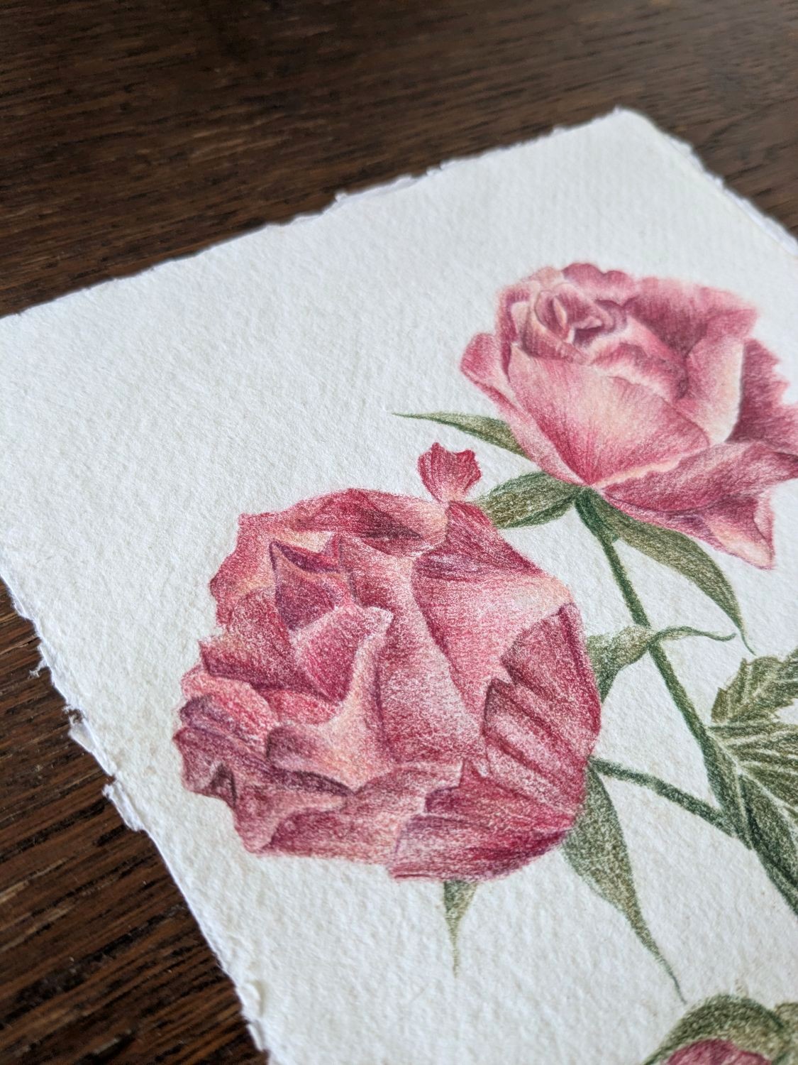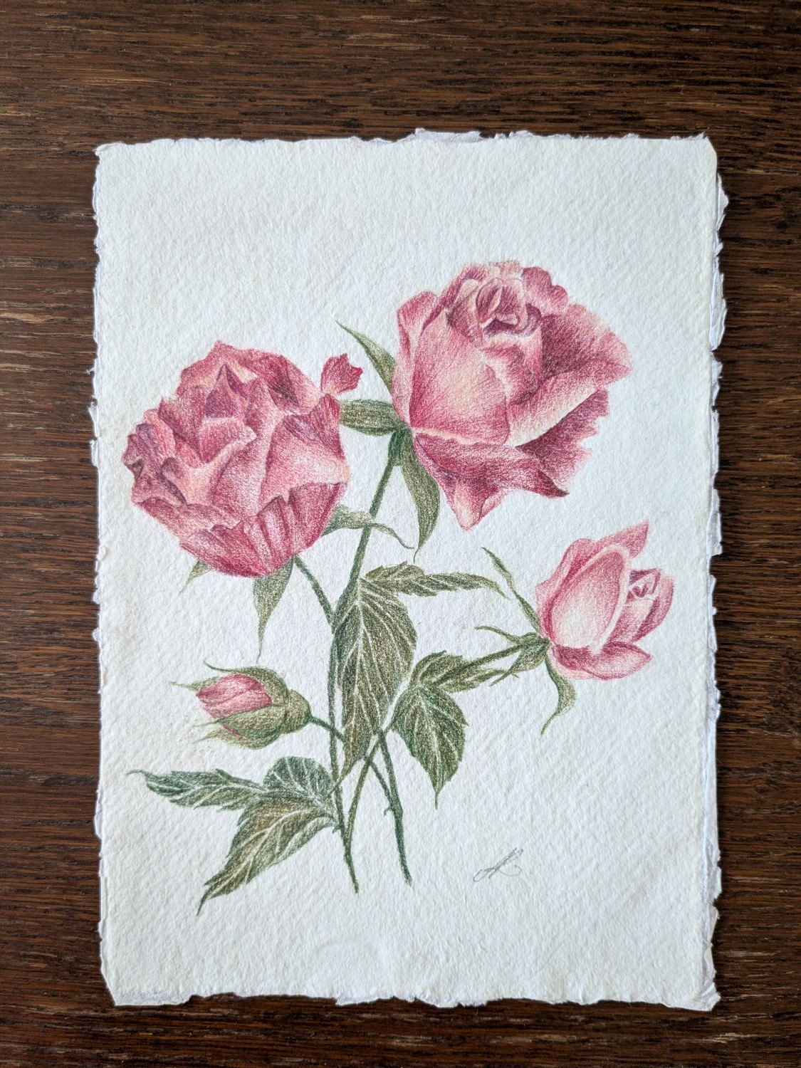 Réalisée sur un papier coton texturé, cette illustration de roses aux crayons de couleur apportera un côté champêtre et romantique à votre intérieur.